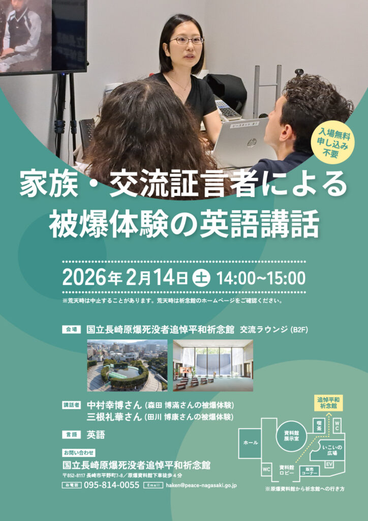 下記の日時、家族・交流証言者による被爆体験の英語講話を実施します。入場無料、申込みは不要です。